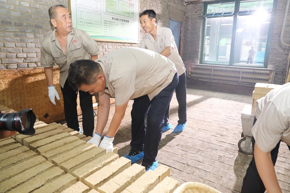 汾酒制曲工艺“一重排列,二重翻曲,三重控制”。单从卧曲手艺来说,手似一杆称,拿曲知轻重,轻曲放两边,重曲放中间,排列3层“一字形”。曲坯晾利后,盖苇席进行上霉,上霉以薄撒的芝麻霉为佳。上霉结束后开窗晾霉,曲坯爽利发硬后开始翻曲,阵形从3层的“一字形”到4层排列的“品字形”,阵型会随着时间和火候的变化不断上下翻整,进入潮火期抽去苇杆排列5层、6层至7层曲坯“人字形”。从卧曲的4005块开始,到制曲结束的26天时间里需要翻曲11次以上,从“一字形”到“品字形”再到“人字形”,每一层的阵形变化和排场设计,都有不同的用意和作用,都是为了科学的营造微生物菌种的生存环境,激发最佳状态,从而制作出最高品质的曲块。入房曲坯排列后要经晾,然后再通过潮火、大火和后火加热,这就是有名的“两热两晾”工艺。在这个过程形成了三种大曲:清茬曲、后火曲和红心曲,它们有的要大热大晾,有的要中热中晾,有的要多热少晾,热时微生物进入,晾时排出潮湿。在这整个工序,除了温度计、湿度计等仪器的运用外,主要凭借人工经验对不同曲的温度和湿度标准进行控制完成的,这种烦琐的温湿度人工控制是通过窗户大小开合来控制,这就是汾酒制曲最讲究的“艺人功底”。千年汾酒传承到今天,积累了不计其数的宝贵经验,汾酒制曲师傅与众不同的技法和细微操作,成就了汾酒大曲的独一无二。