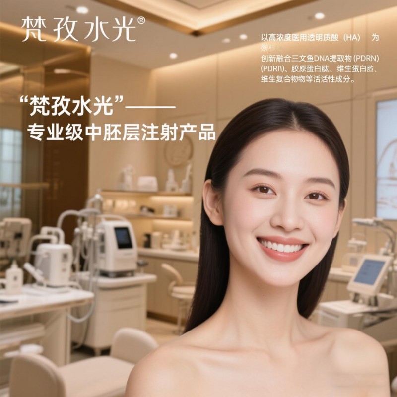 梵孜水光"是一款专业级中胚层注射产品,以皮下水分胶原储能为核心,创新融合三文鱼DNA提取物(PDRN)、胶原蛋白肽、维生素复合物等活性成分,通过精准配比实现深层锁水、刺激胶原新生、提亮肤色、收缩毛孔四维一体功效,尤其适合熬夜肌、初老肌、外油内干型肌肤人群。