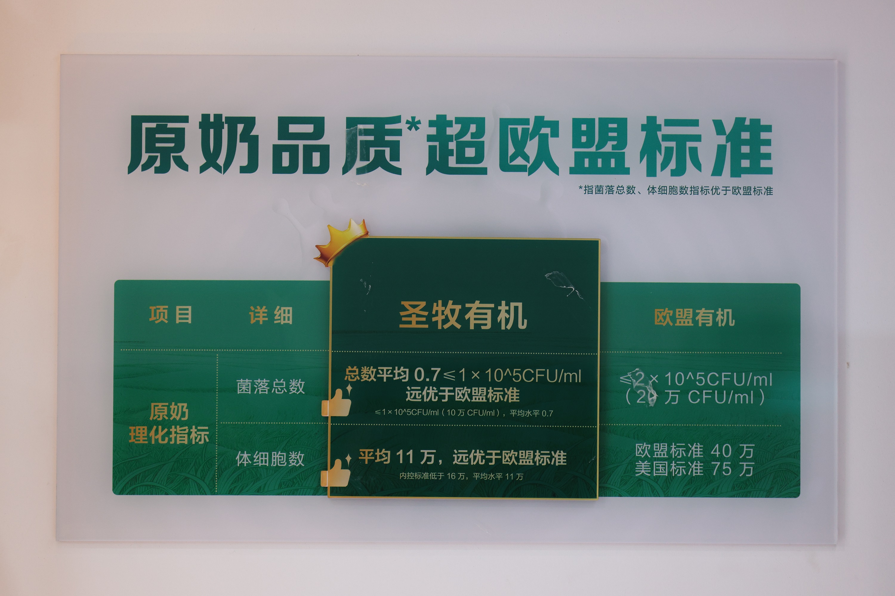 这条链路,从土地开始算起:牧草种植遵循有机农业原则,不用化肥和农药;奶牛的饲喂、活动环境按有机要求管理,把潜在风险挡在源头之外。接下来是原奶环节,围绕蛋白质、钙等关键指标设定了比常规更高的门槛(超越欧盟有机标准),再通过多项检测进行确认。