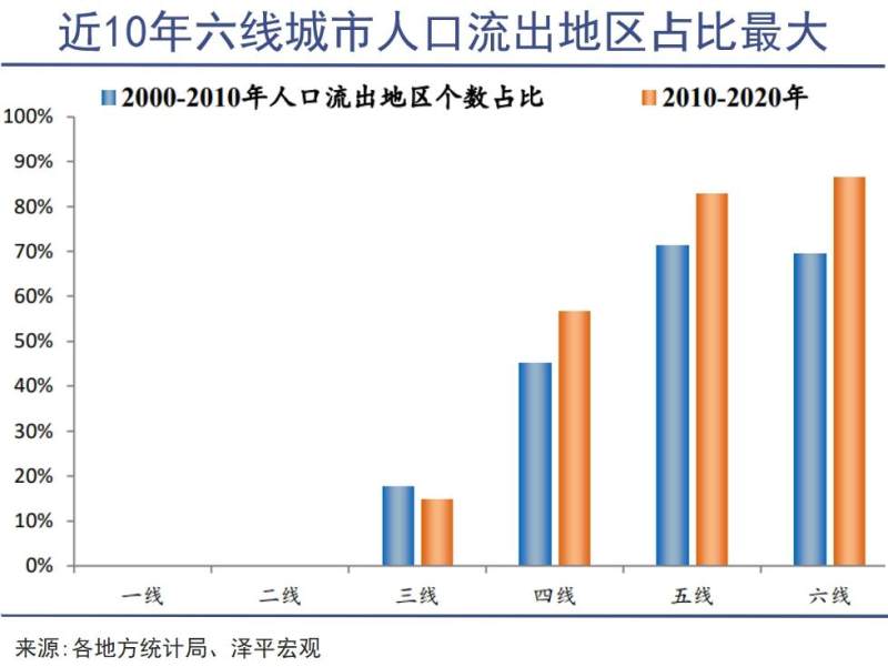 相比21世纪头十年,2010-2020年间,四线城市人口流出个数比例从45%增至57%、五线城市从71%增至83%、六线城市从69%增至86%。