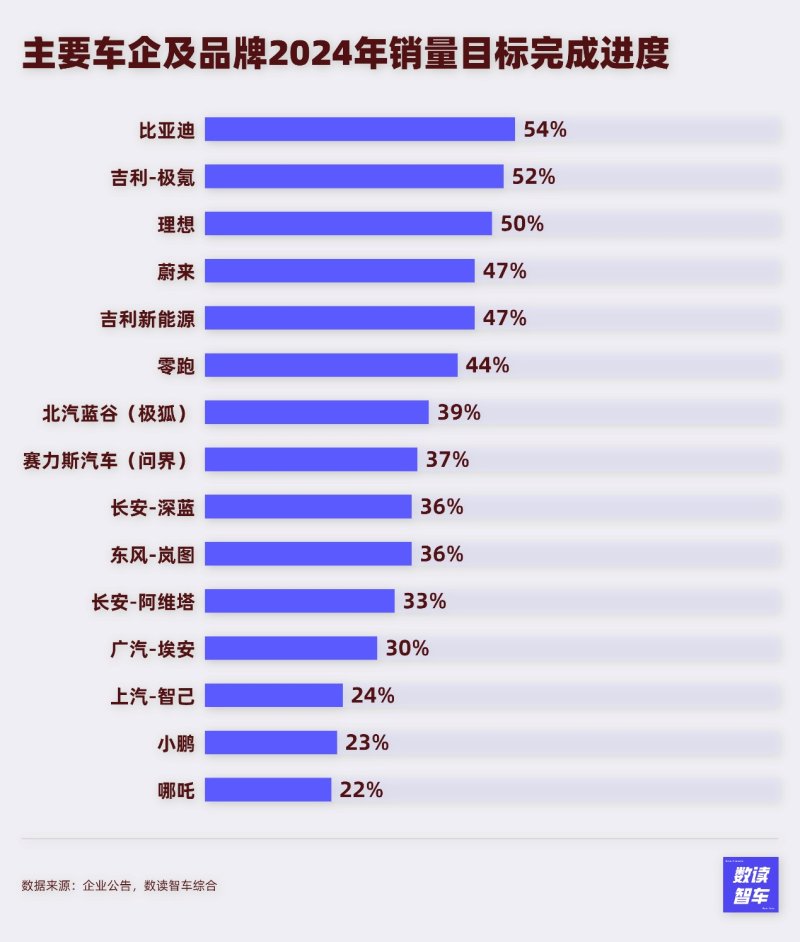 得益于最近几个月的积极表现,蔚来和零跑的进度也逐渐赶上,蔚来完成了47%,零跑完成了44%。