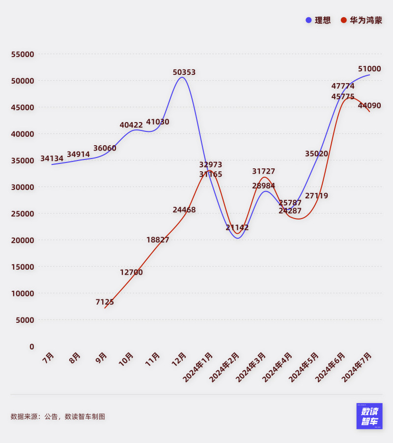 7月,理想单月销量突破前期新高,来到51000台,最近三个月连续跨越新的台阶。此消彼长,华为鸿蒙系的车型却始终没能突破5万大关。即便从6月开始,智界车型开始向市场发售,华为鸿蒙系的问界和智界加起来也不如理想销量高。