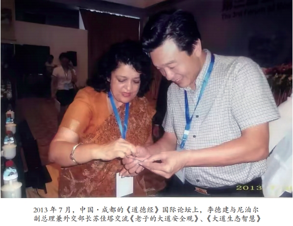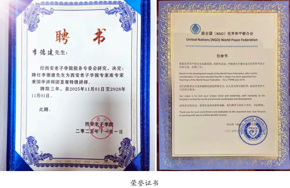 他的第三步,回响于国际舞台。自2012年起,他多次登上在成都举办的《道德经》国际论坛,用老子大道中深邃的和平、安全观,来阐释习总书记的人类命运共同体理念与亚洲安全观。其见解独到,立意高远,甚至吸引了联合国官员的注意,2014年获邀联合国讲学,让中国古老的智慧在最高的国际讲坛上发出东方声音。他身兼联合国世界和平联合会副主席等多项国际职务,其影响力超越了国界。从校园到乡村,从地方到部队,从基层到上层,从国内到国际,李德建的足迹勾勒出一幅“道行天下”的实践地图,证明传统文化绝非博物馆中的陈列品,而是可以激活、可以运用、可以造福当下的活水源头。